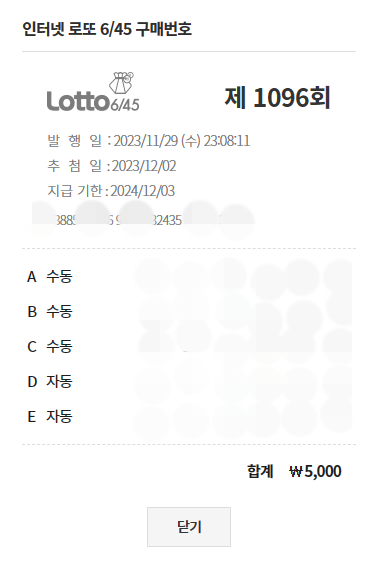 오늘은 동행복권 로또 온라인으로 구매하는 방법을 알아보았습니다. 그리고 온라인에서 로또는 5,000원 밖에 구매가 안 된다는 점 참고하시고 모두 1등 되시길 기원하겠습니다.